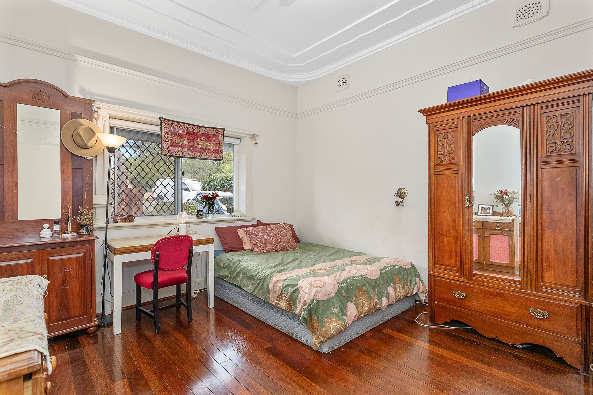 The home features lovely, high ornate ceilings, polished Jarrah boards, original wooden doors and frames, 3 very big bedrooms and a large living room with fireplace.